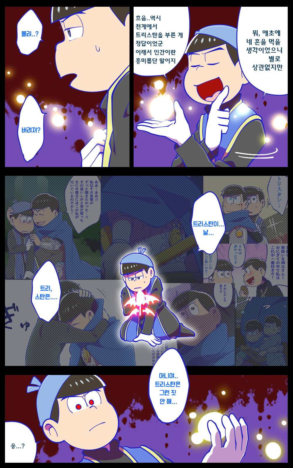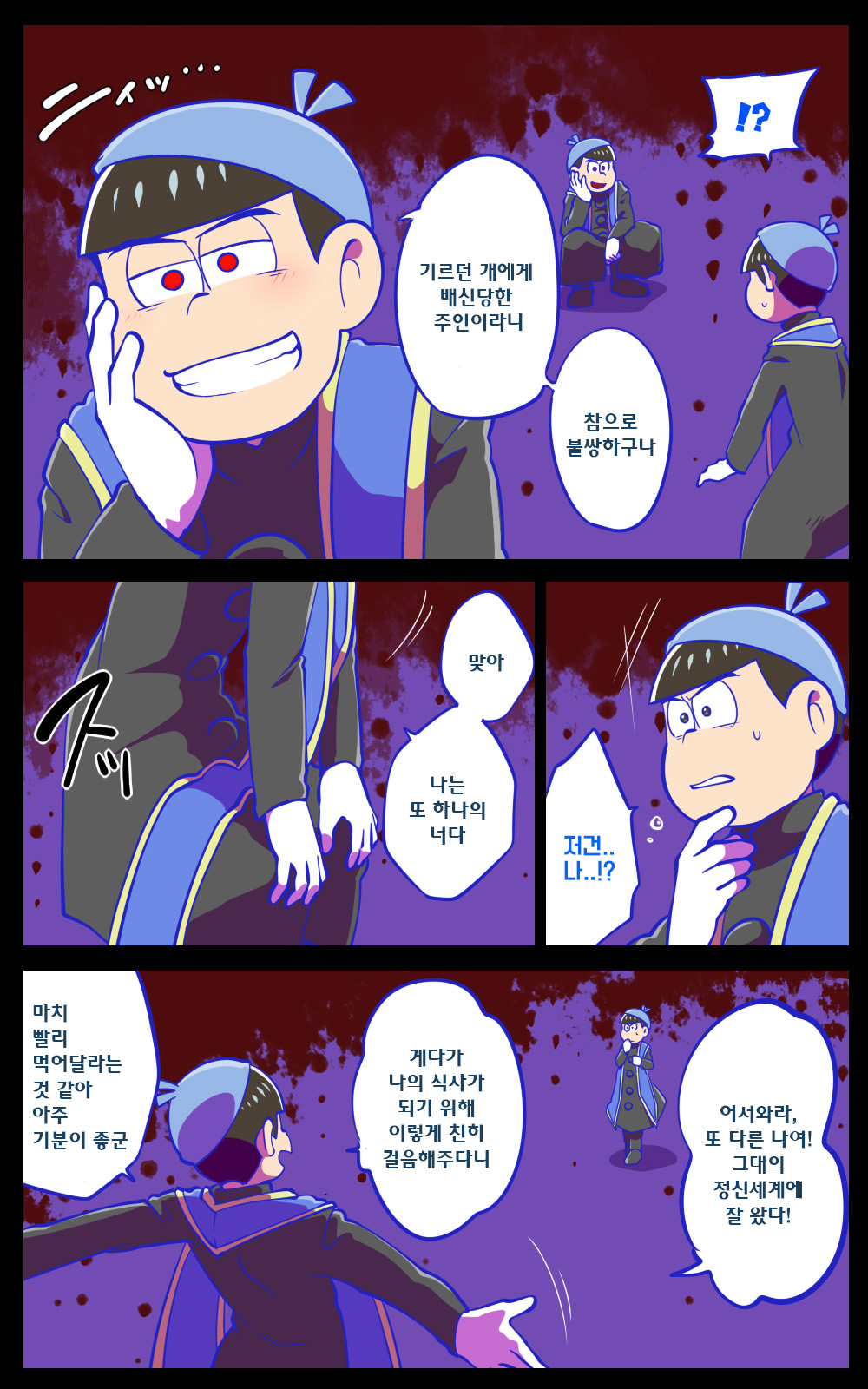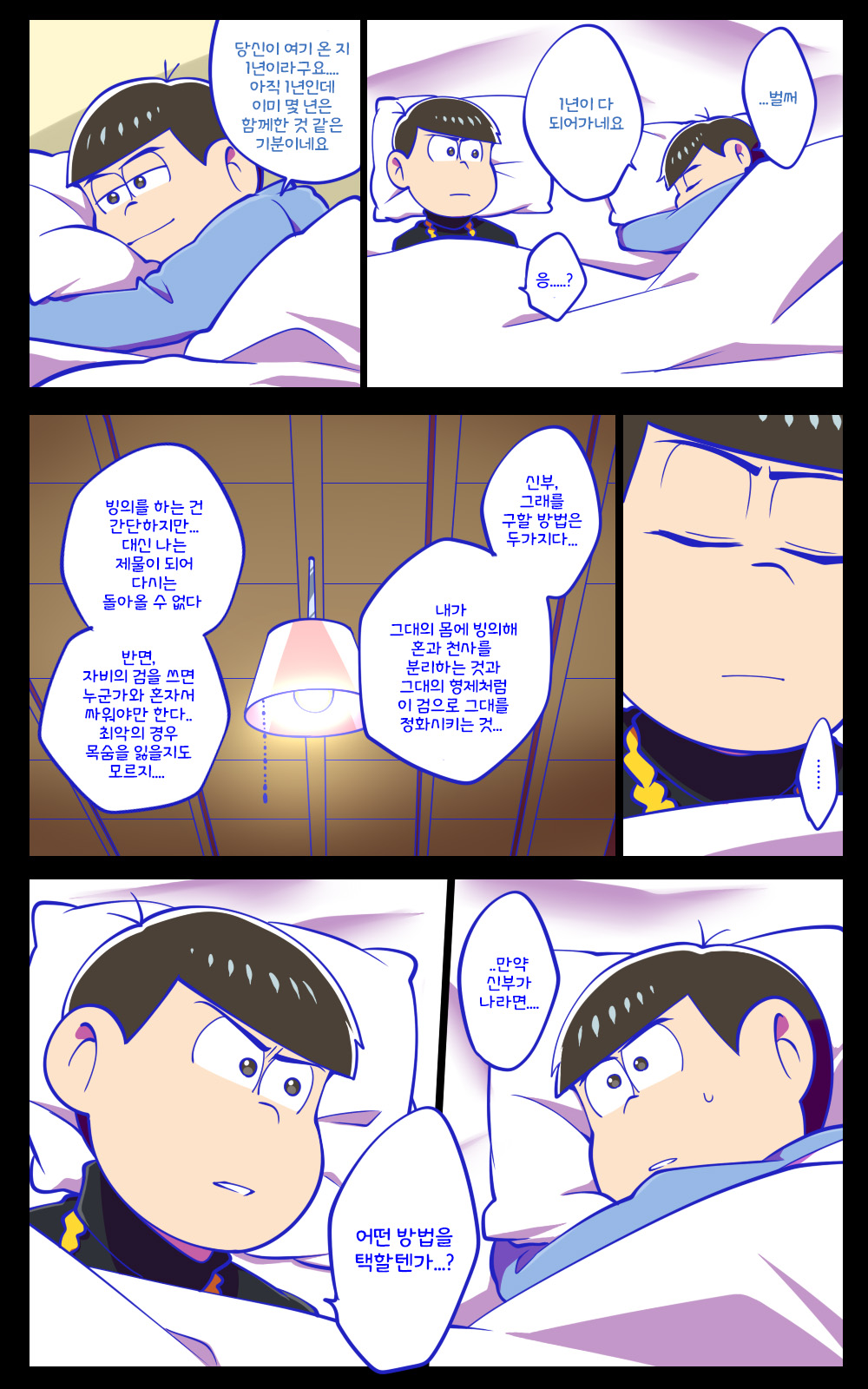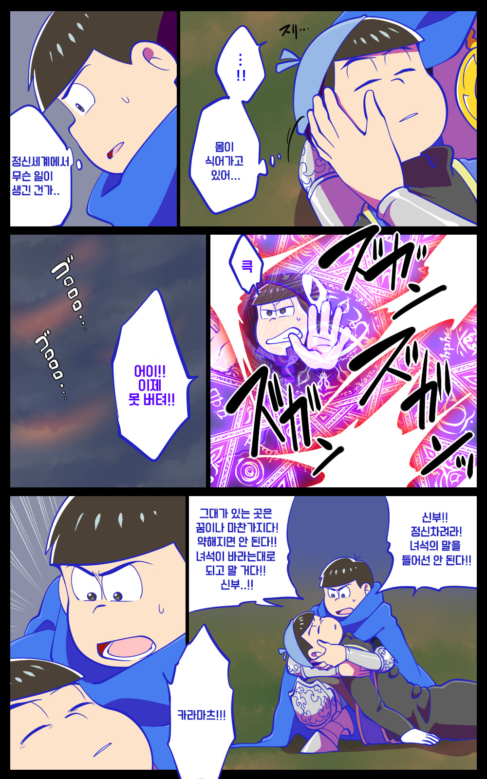 예쁘게 묶여있던 머리를 이리저리 헝클이며 울부짖는 토도마츠. 그 옆에서 쥬시마츠가 등을 어루만져주고 있다. 생각에 잠긴 듯, 손가락으로 턱을 어루만지던 카라마츠가 입을 열었다.
