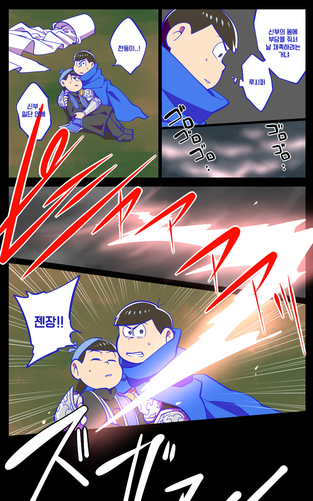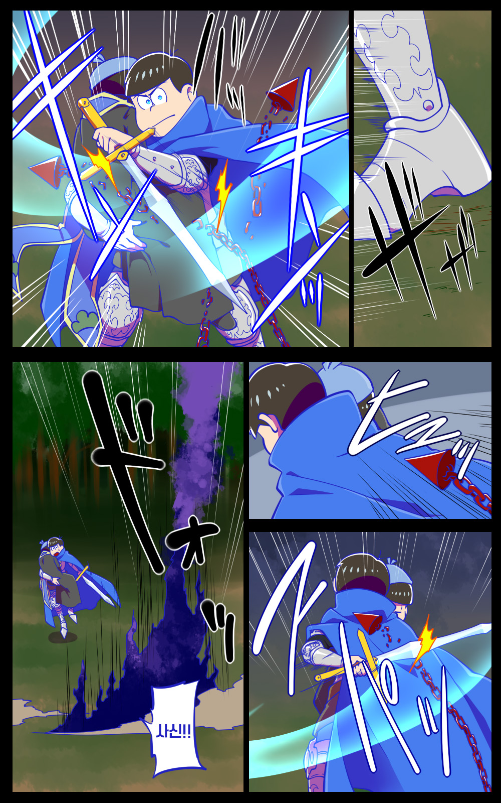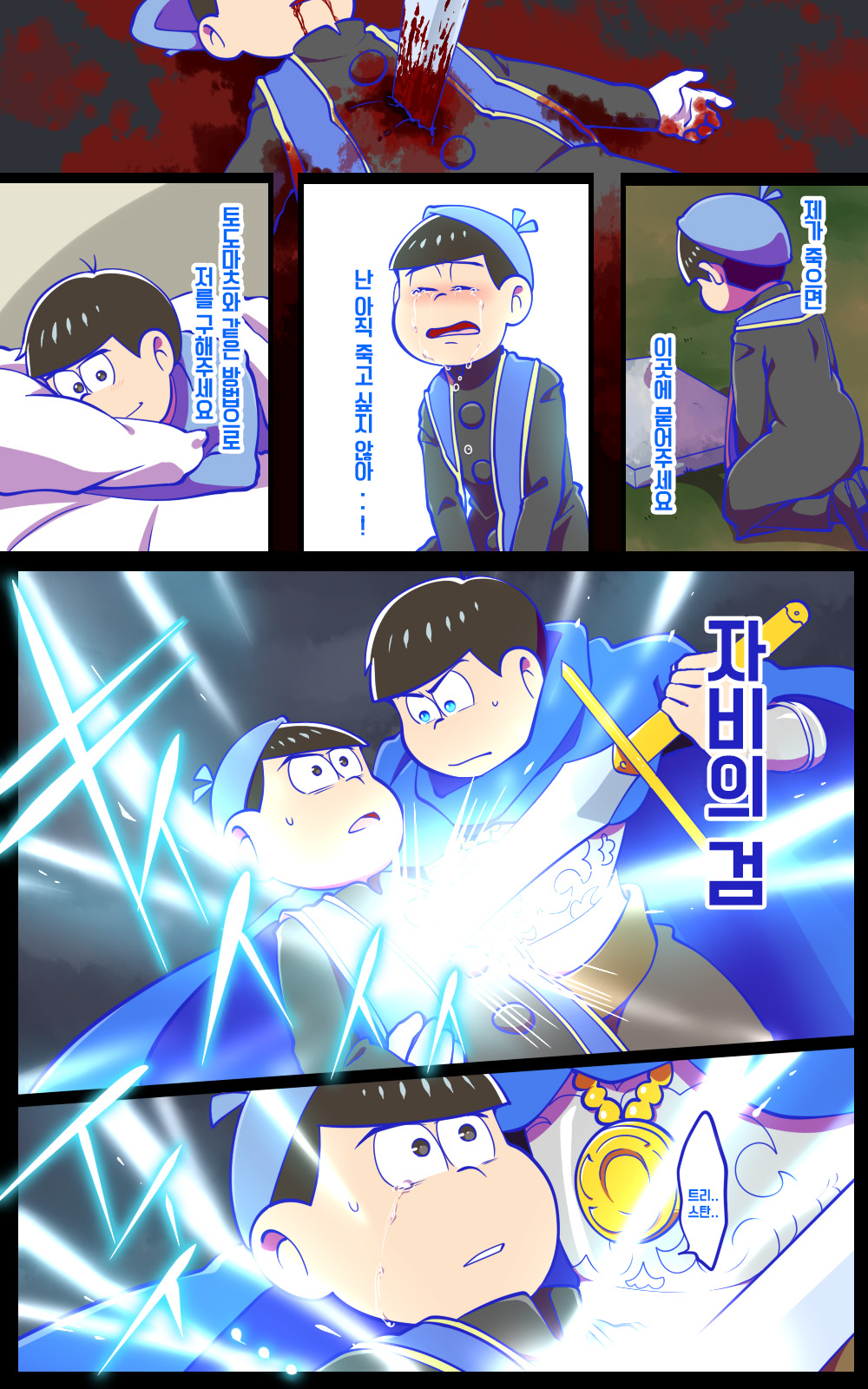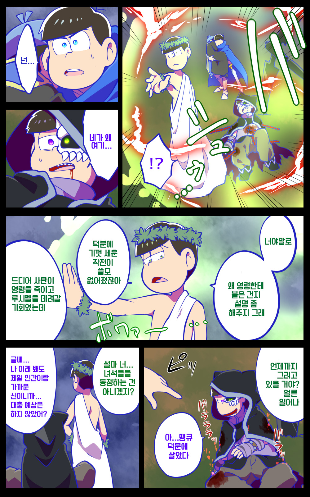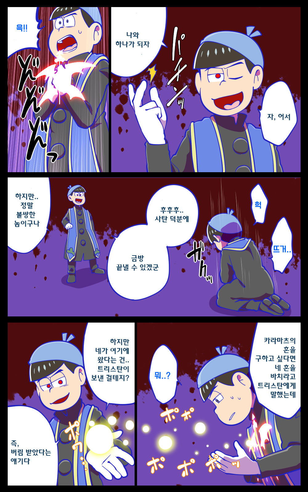예쁘게 묶여있던 머리를 이리저리 헝클이며 울부짖는 토도마츠. 그 옆에서 쥬시마츠가 등을 어루만져주고 있다. 생각에 잠긴 듯, 손가락으로 턱을 어루만지던 카라마츠가 입을 열었다.