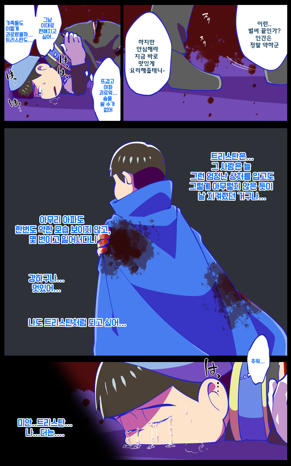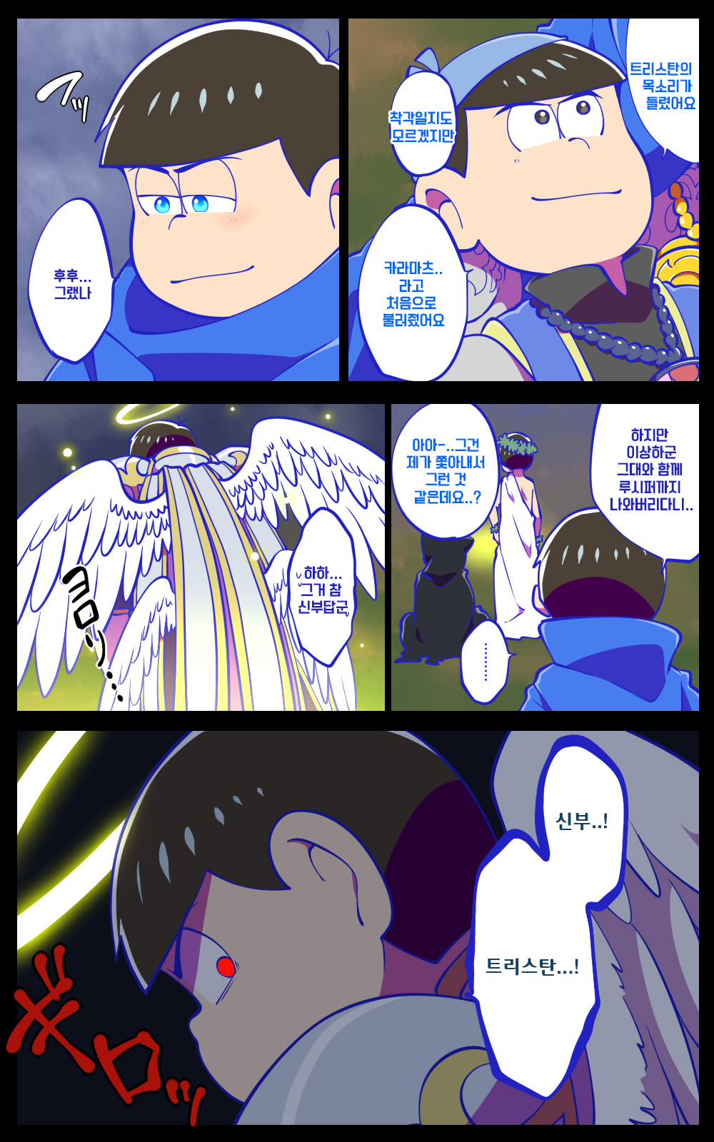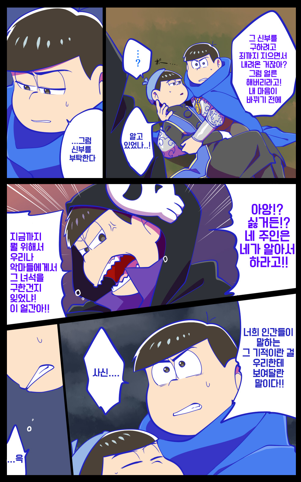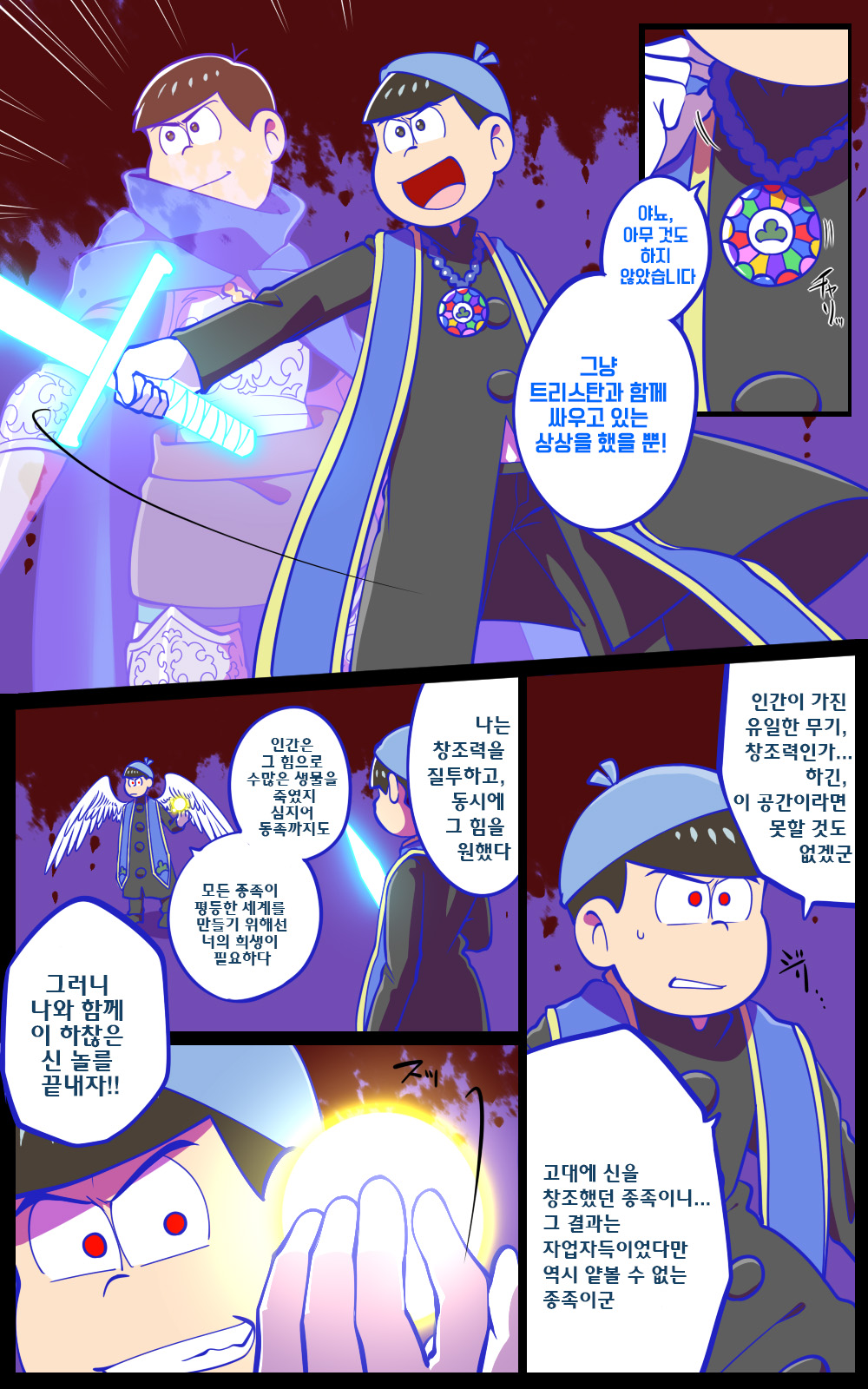 예쁘게 묶여있던 머리를 이리저리 헝클이며 울부짖는 토도마츠. 그 옆에서 쥬시마츠가 등을 어루만져주고 있다. 생각에 잠긴 듯, 손가락으로 턱을 어루만지던 카라마츠가 입을 열었다.
