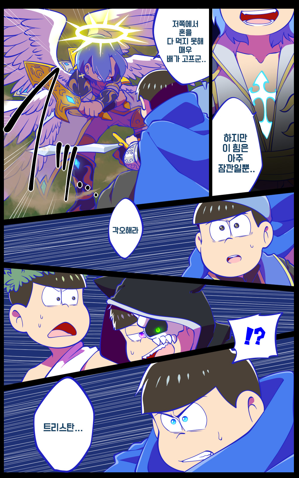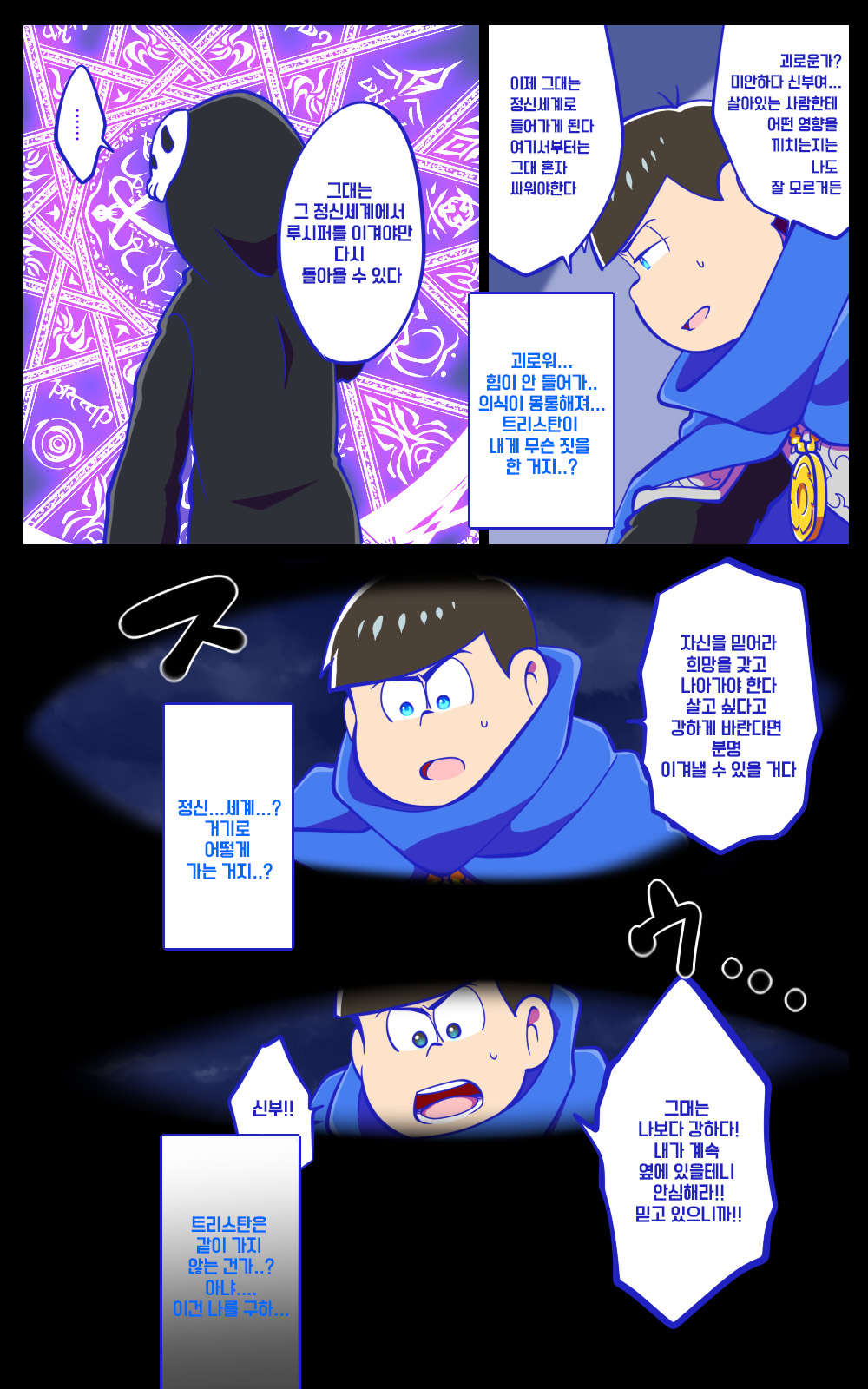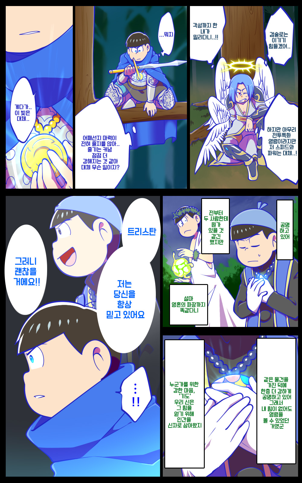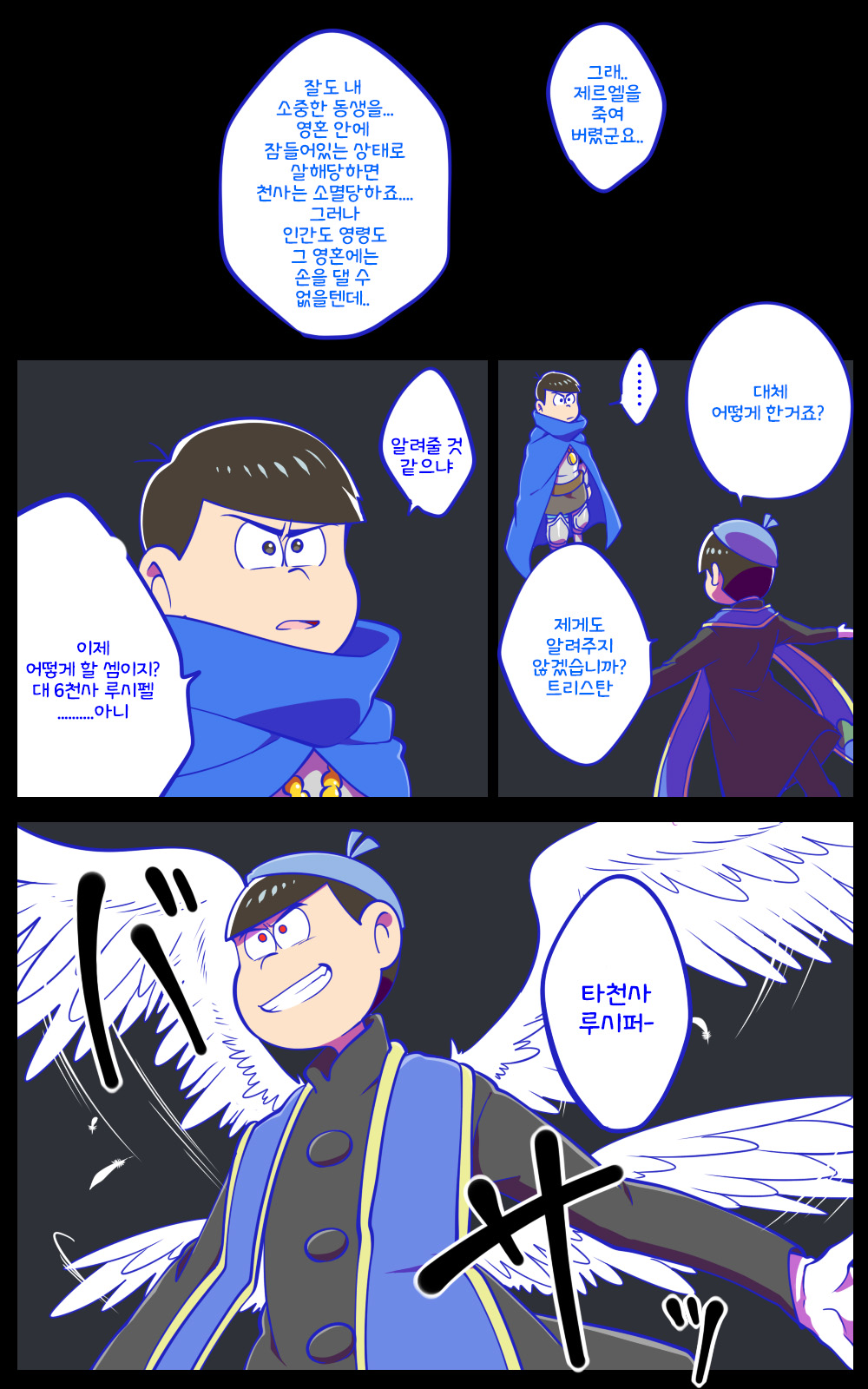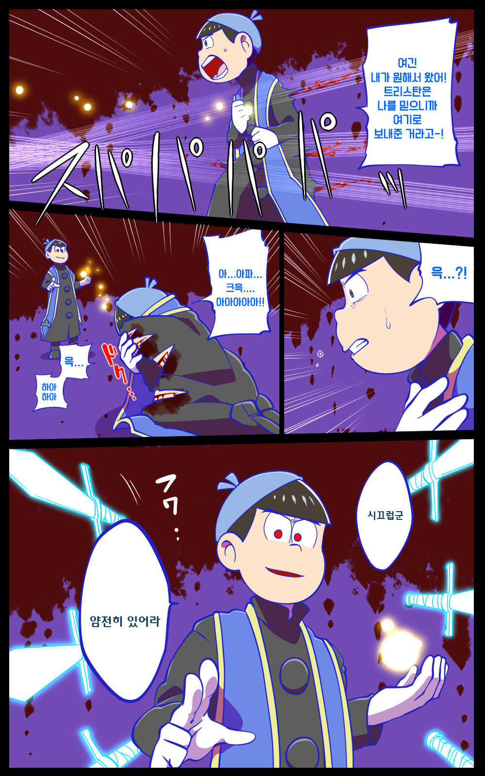 예쁘게 묶여있던 머리를 이리저리 헝클이며 울부짖는 토도마츠. 그 옆에서 쥬시마츠가 등을 어루만져주고 있다. 생각에 잠긴 듯, 손가락으로 턱을 어루만지던 카라마츠가 입을 열었다.
