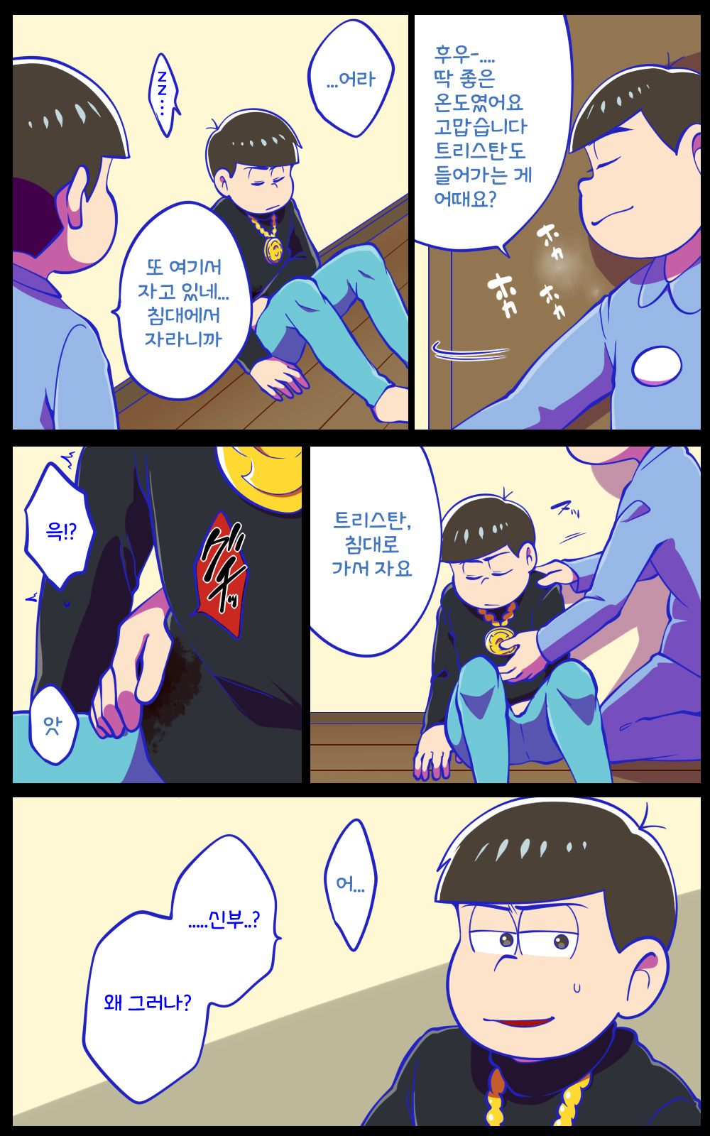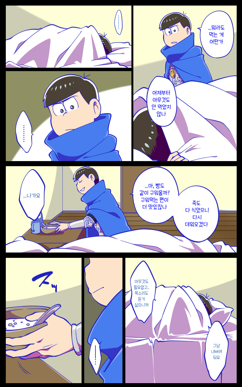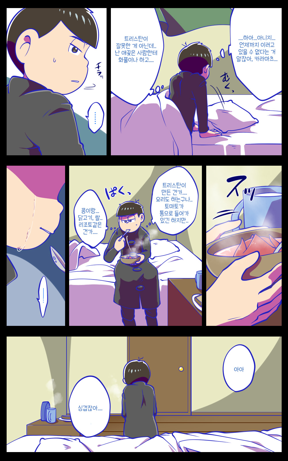 언제부턴가 쵸로마츠는 오소마츠에게 함부로 굴지 않게 되었다. 물론 오소마츠 외에는 가차없었다. 그것이 쵸로마츠의 작은 변화를 주변 사람들이 알아채지 못한 원인이기도 했다. 하지만 오소마츠만은 그 변화를 알아챘다. 그런 쵸로마츠의 마음에 한 발 내딛지 못하는 자신은 도대체 무엇이 두려운 걸까. 무슨 생각을 하고 있는지 모르는 걸 두려워하는 걸까. 아니, 여기서 더 변해버리는 것이 두려운 거다. 미지근한 물 같은 이런 애매한 상태가 더 틀어져버리는 것이 두려웠다.