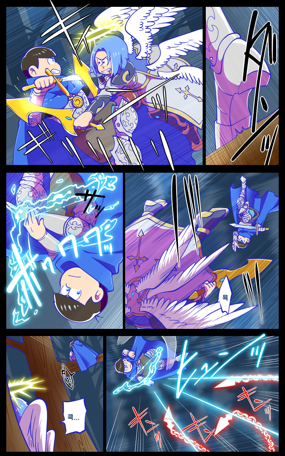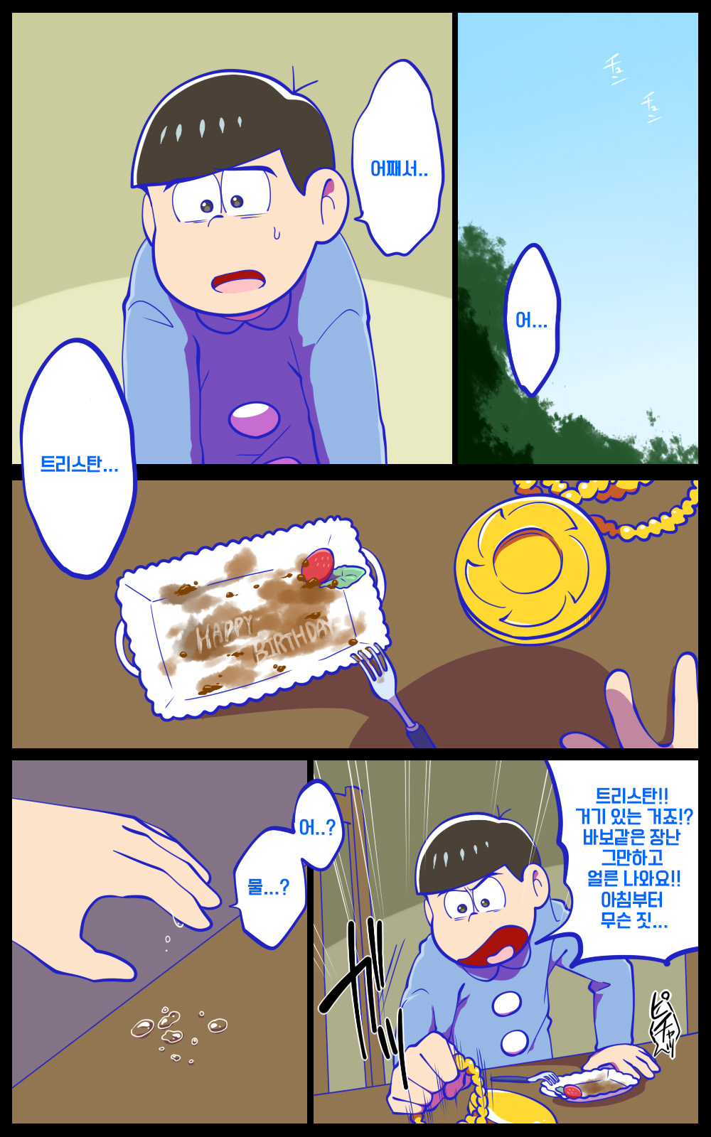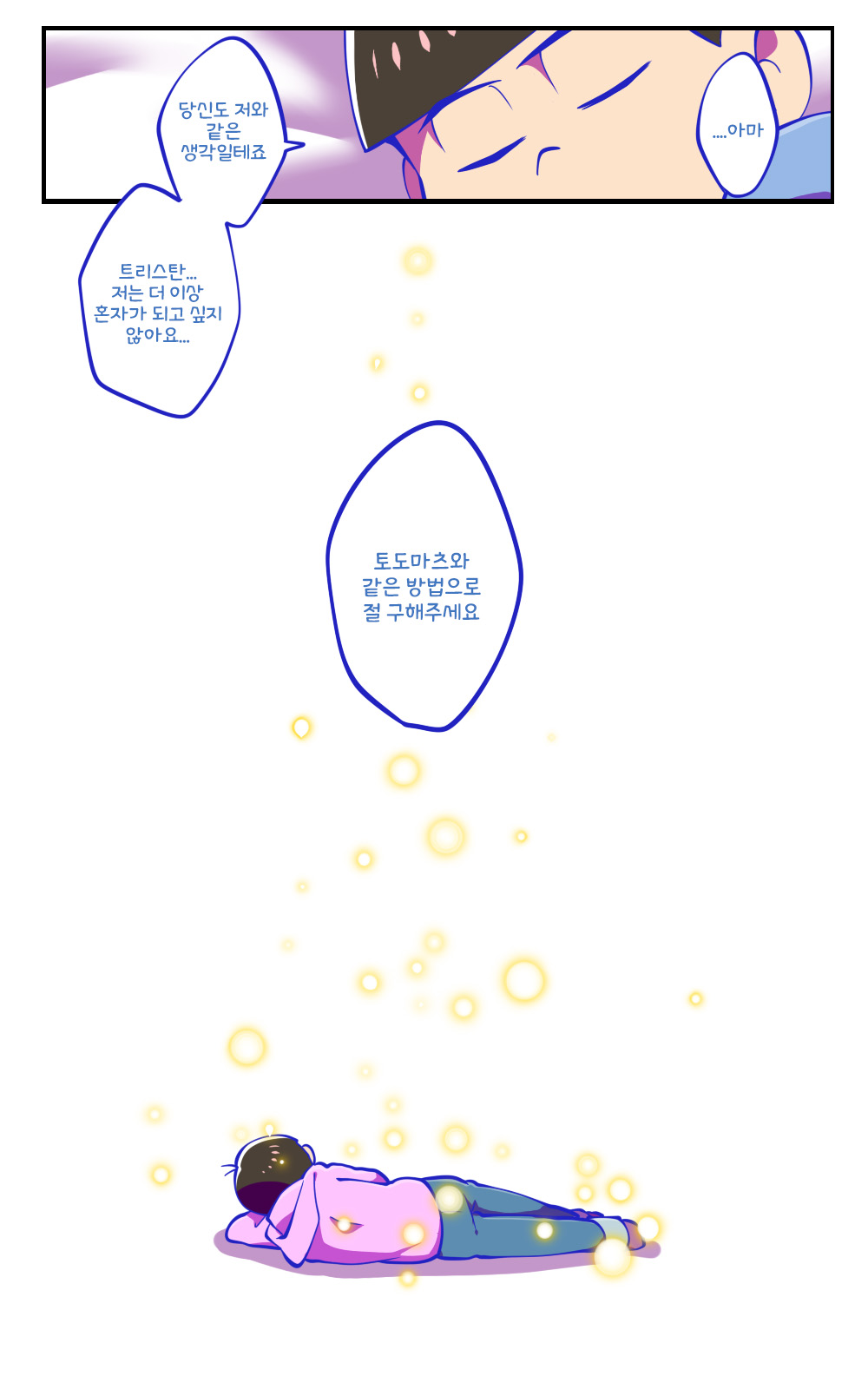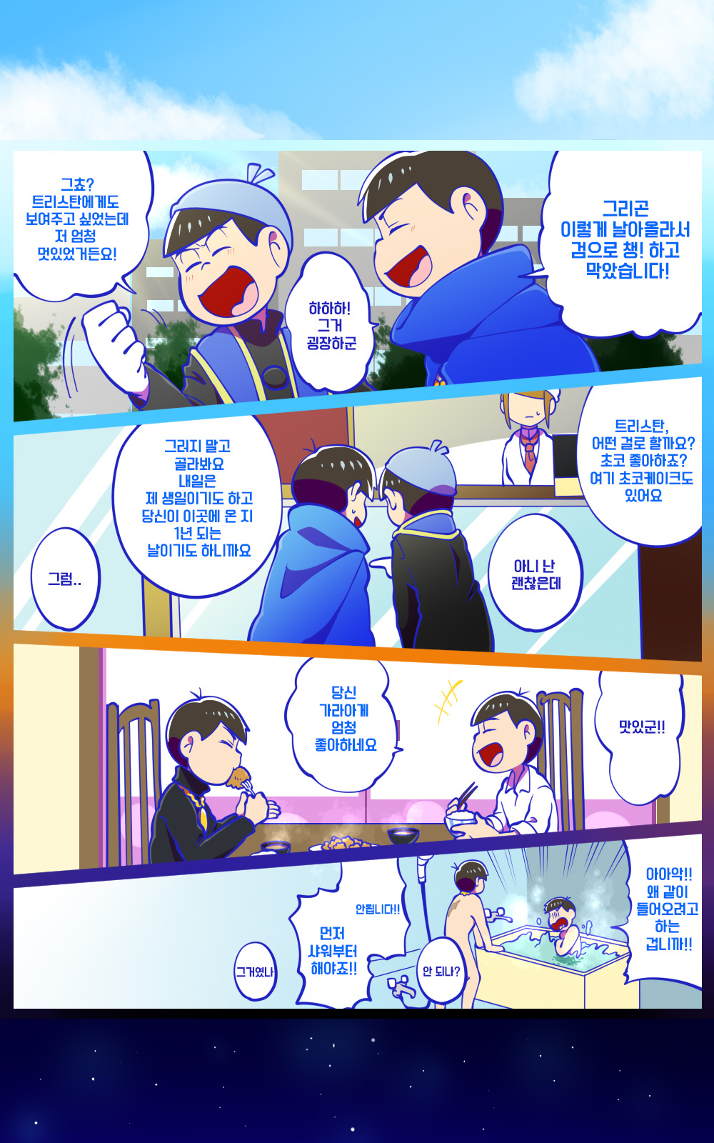 언제부턴가 쵸로마츠는 오소마츠에게 함부로 굴지 않게 되었다. 물론 오소마츠 외에는 가차없었다. 그것이 쵸로마츠의 작은 변화를 주변 사람들이 알아채지 못한 원인이기도 했다. 하지만 오소마츠만은 그 변화를 알아챘다. 그런 쵸로마츠의 마음에 한 발 내딛지 못하는 자신은 도대체 무엇이 두려운 걸까. 무슨 생각을 하고 있는지 모르는 걸 두려워하는 걸까. 아니, 여기서 더 변해버리는 것이 두려운 거다. 미지근한 물 같은 이런 애매한 상태가 더 틀어져버리는 것이 두려웠다.