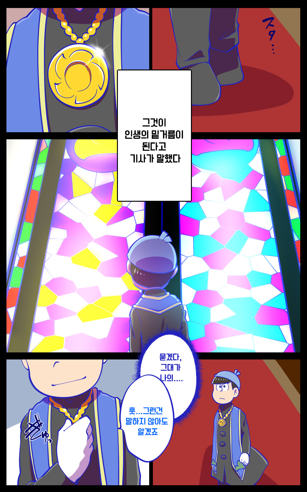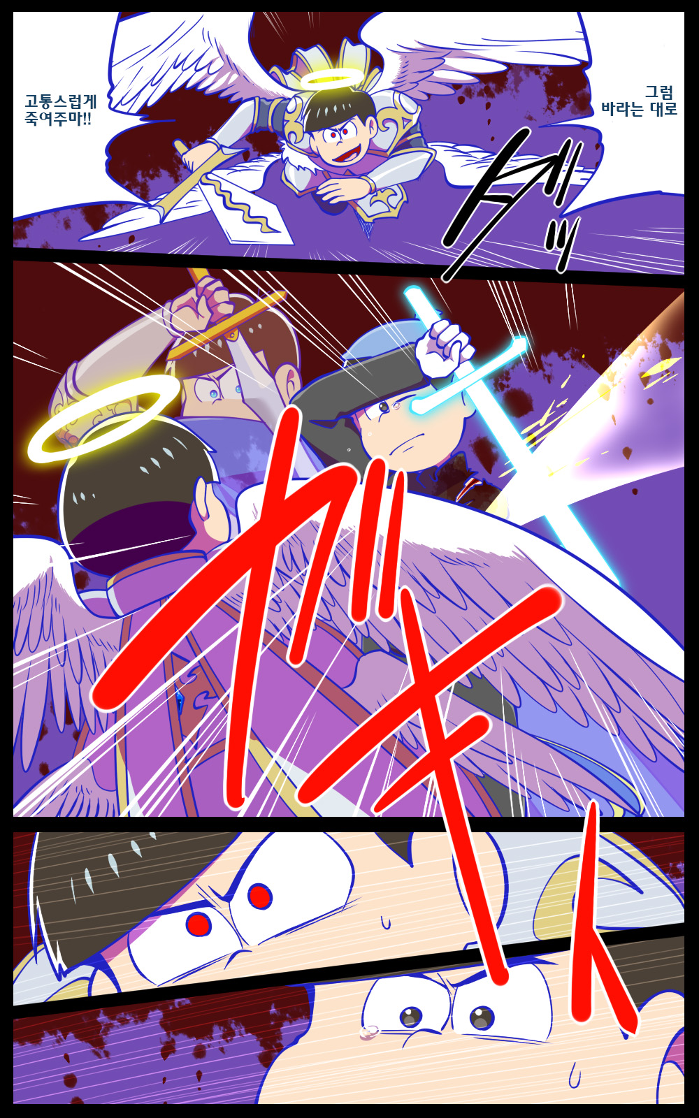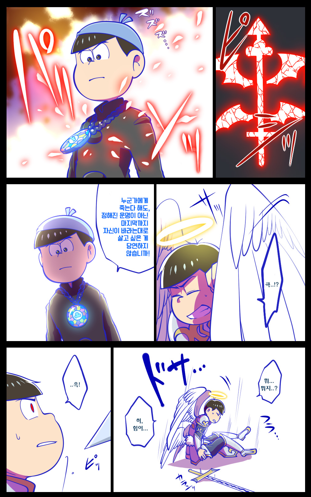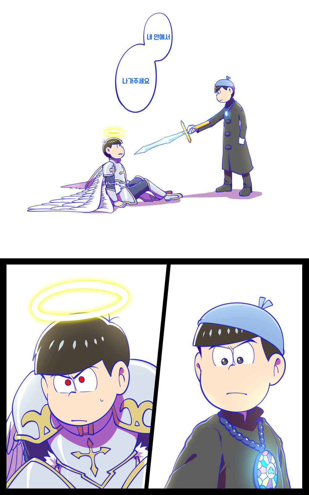 오소마츠가 네 사람을 발견하고 말을 걸었다. 그러나 이내 분위기가 심상치 않다는 걸 알아채고 히죽거리던 얼굴을 싹 바꾸곤 무릎을 꿇고 앉은 두 사람을 내려다보았다.