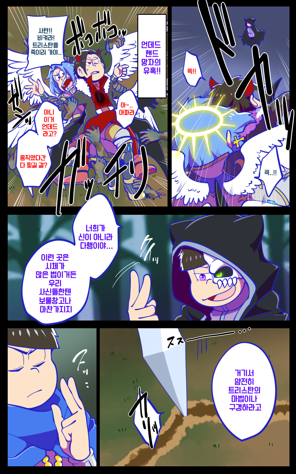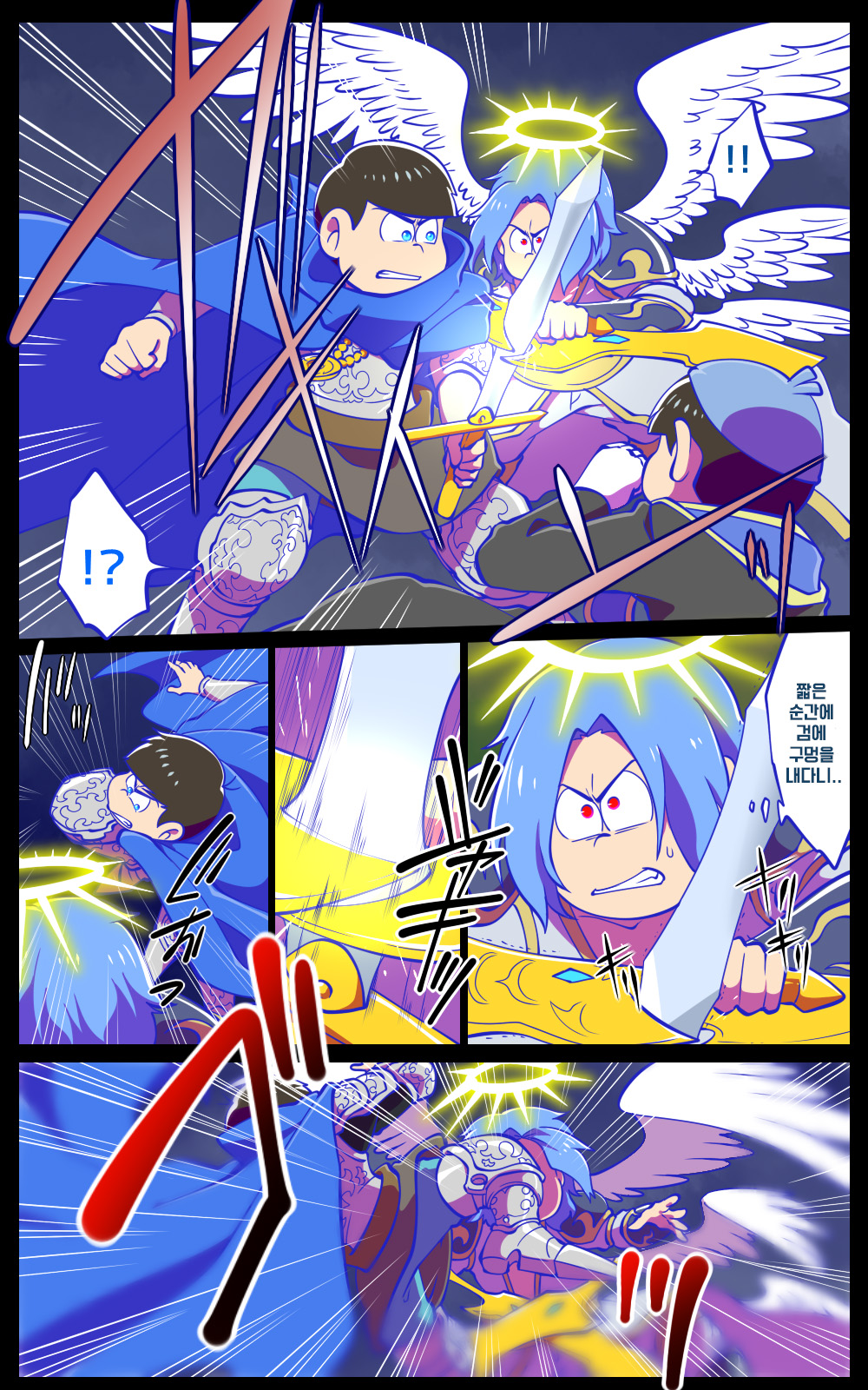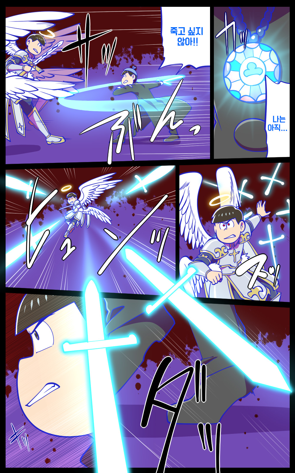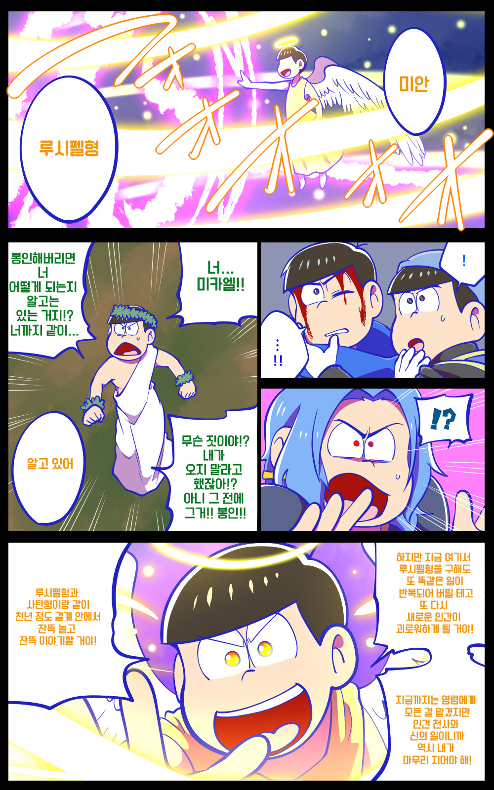 오소마츠가 네 사람을 발견하고 말을 걸었다. 그러나 이내 분위기가 심상치 않다는 걸 알아채고 히죽거리던 얼굴을 싹 바꾸곤 무릎을 꿇고 앉은 두 사람을 내려다보았다.