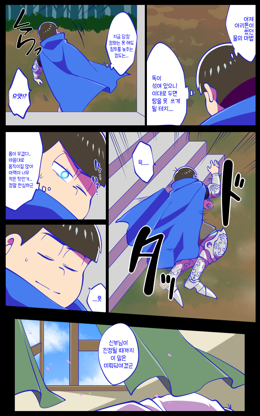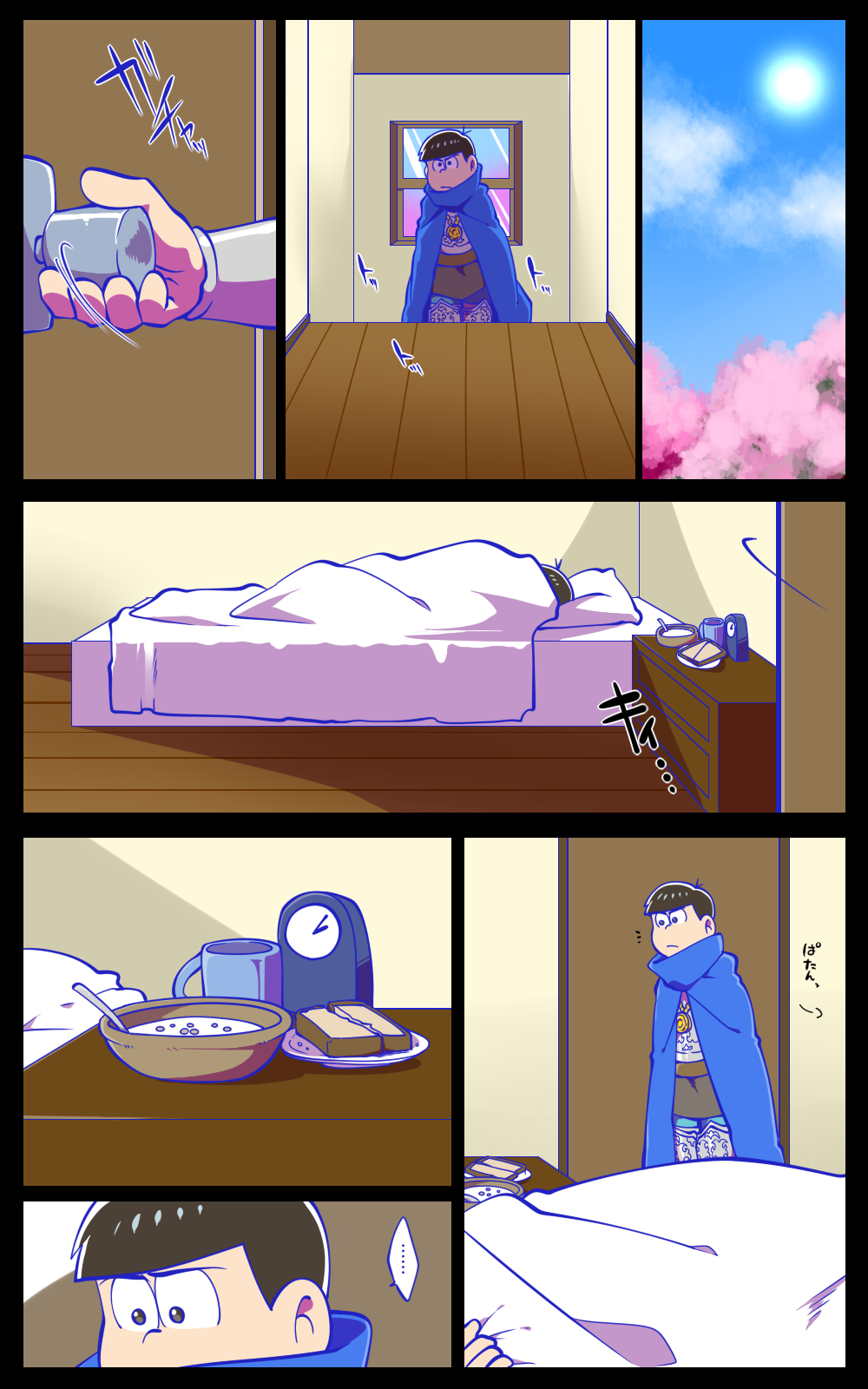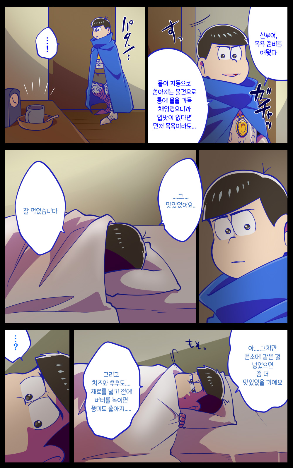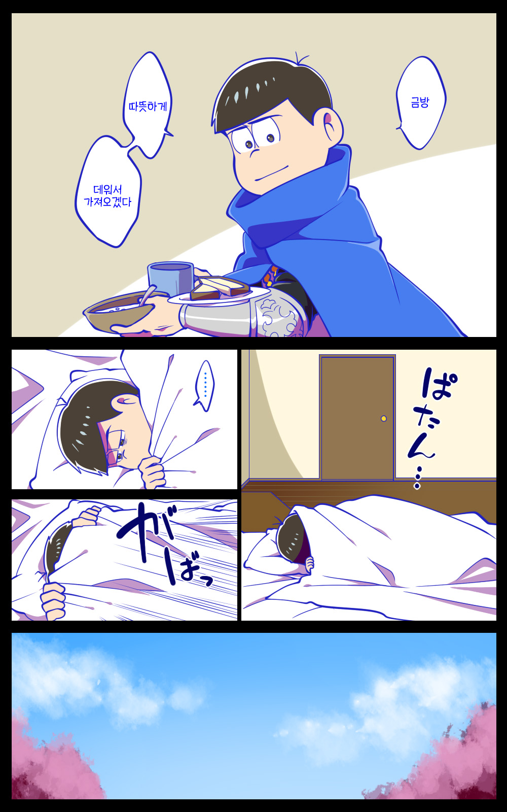 방으로 돌아간 오소마츠는, 바닥에 깔린 이불에 들어앉았다. 쵸로마츠는 설거지와 빨래로 바빠서 아마 한동안은 방에 돌아오지 않을 거다.