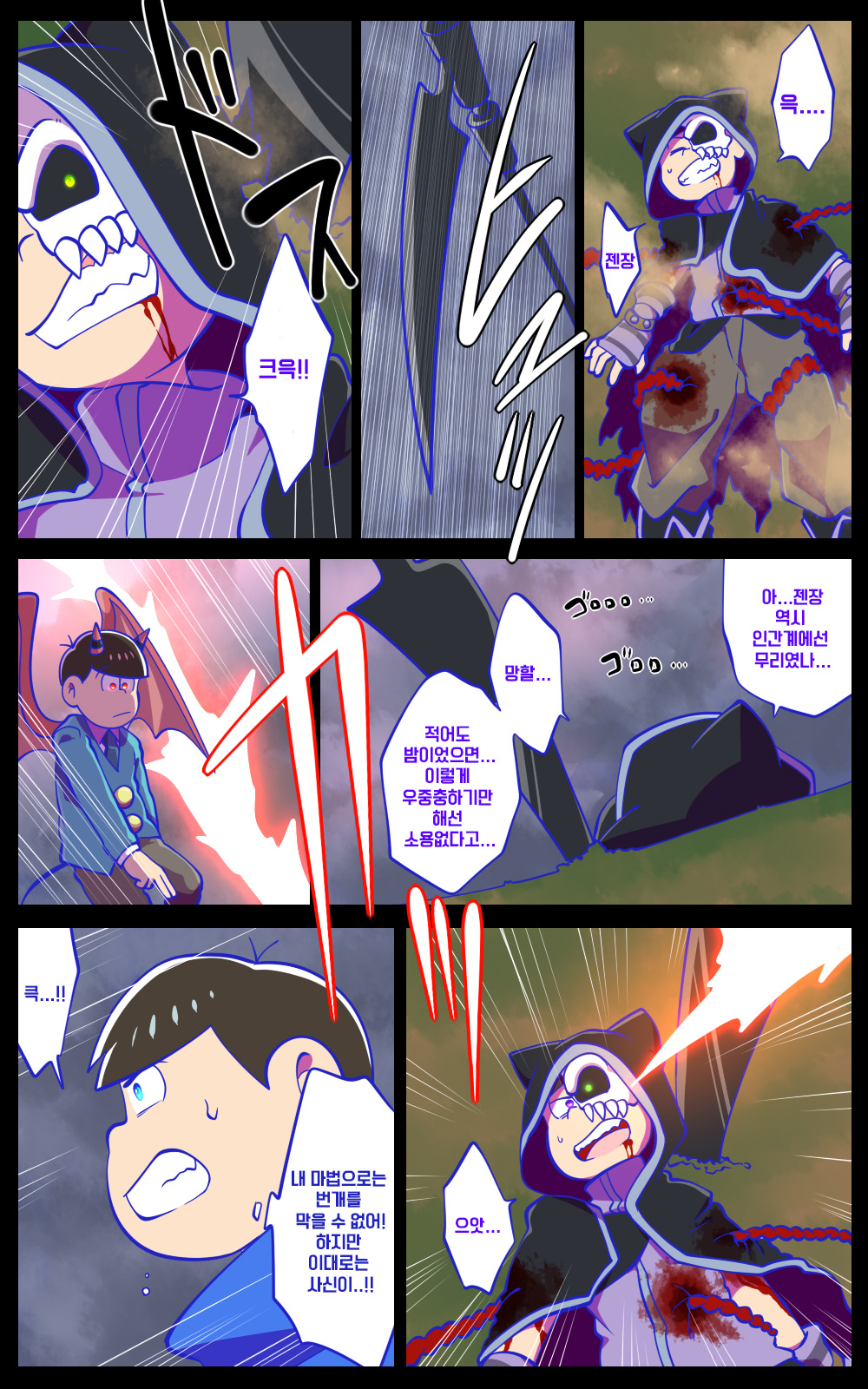 얼굴에 짙은 어둠을 드리운 이치마츠와 토도마츠가 섬뜩하게 웃는다. 카라마츠와 쥬시마츠는 그대로 땅바닥에 무릎을 꿇고 앉아 머리를 조아리며 사죄하기 시작했다.