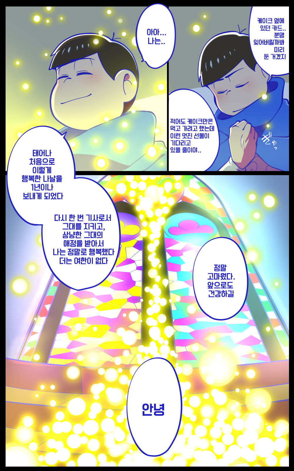 오소마츠는 다시금 혼잣말을 중얼거리며, 천장의 등에 매달린 끈을 멍하니 바라보았다. 쵸로마츠가 돌아오면 밤새 끌어안고 잠을 자야겠다 마음을 먹은 그는 쵸로마츠의 이불 위에 누워 눈을 감았다.