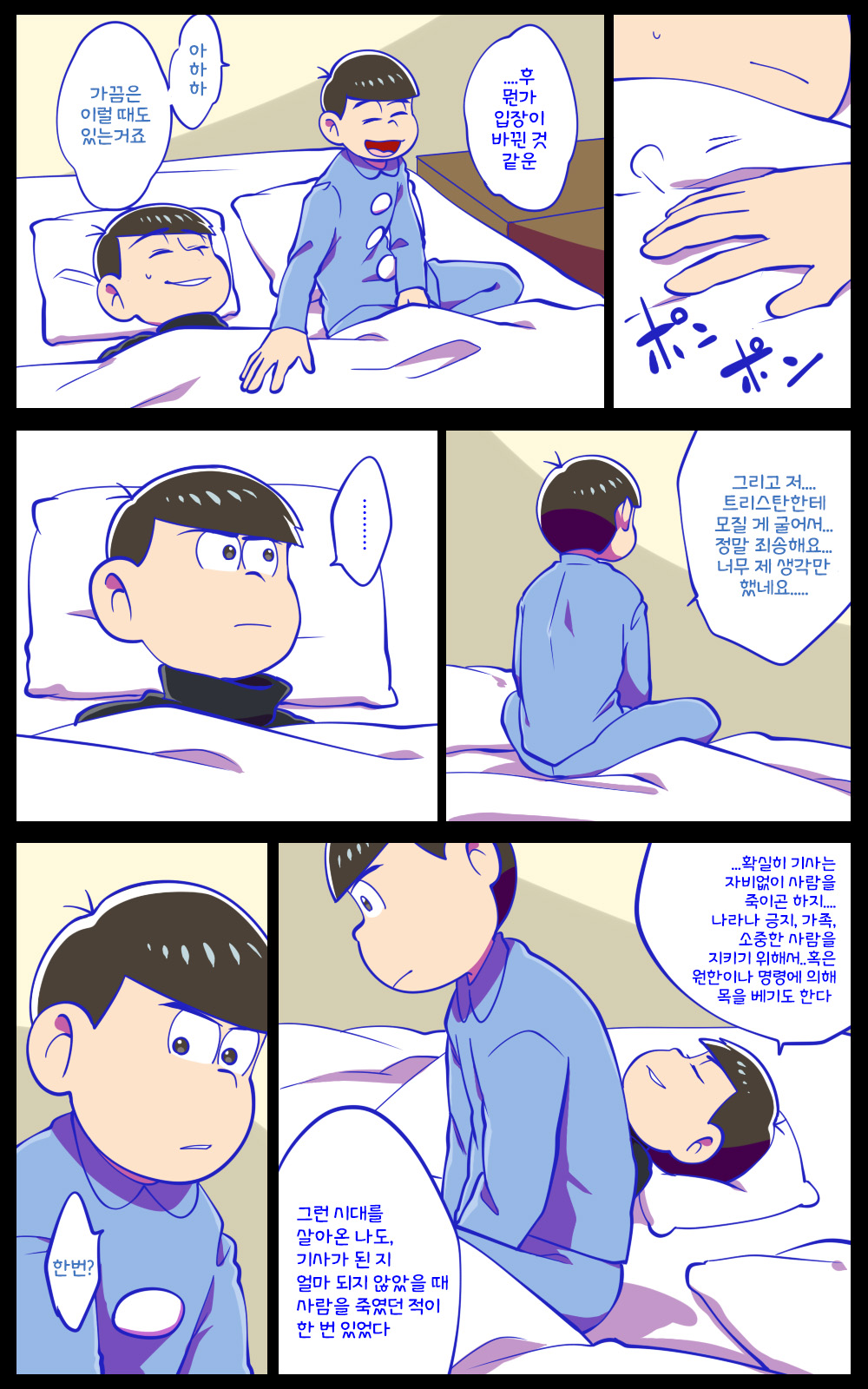 쵸로마츠는 자신의 무릎 위에서 편하게 잠든 오소마츠의 얼굴을 말없이 바라보며 미소지었다.